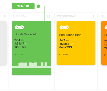 Color-coded workout cards show exactly how close you are to completing every planned workout with just a glance.